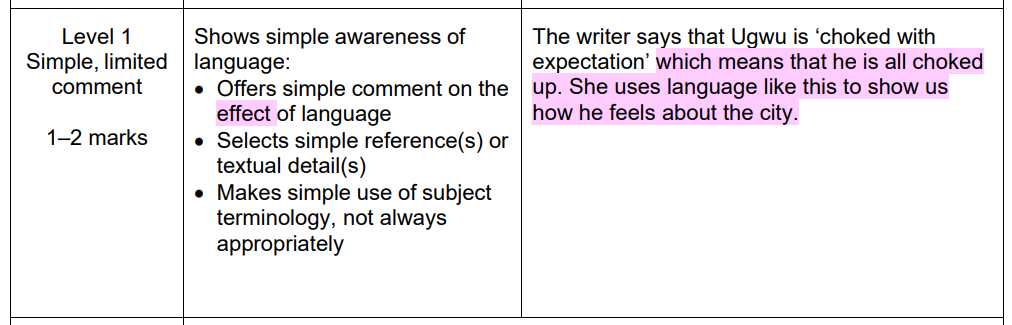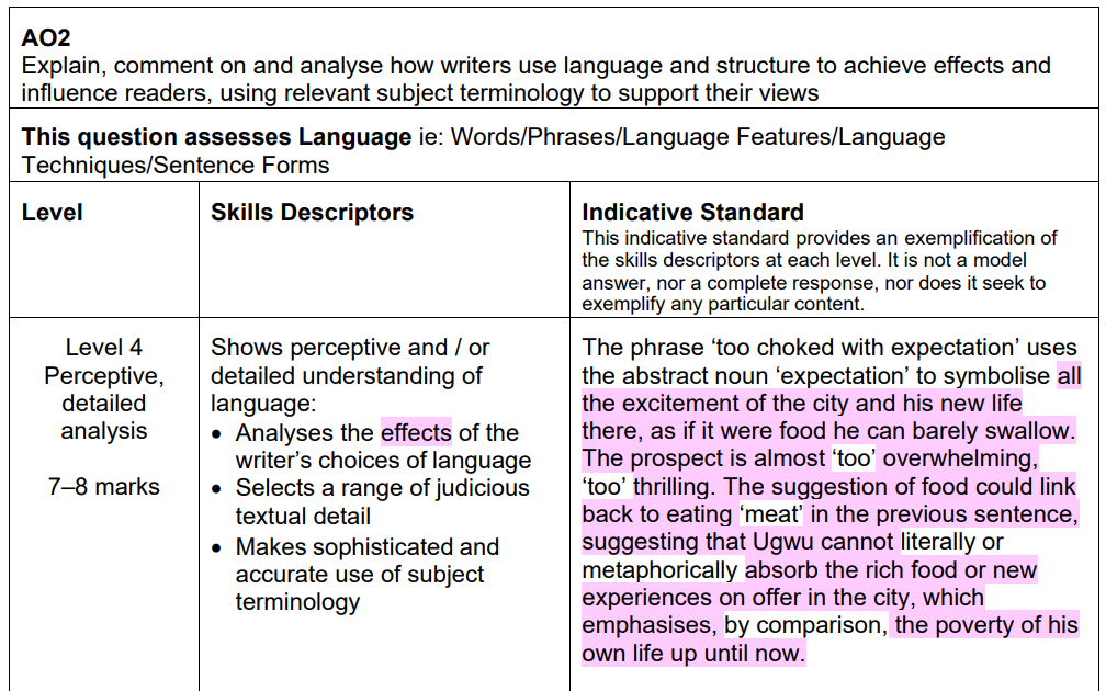 Take a look at the following screenshots of an AQA GCSE English language mark scheme for an 8-mark question from the November 2021 paper. Note the differences between a level 1 and a level 4 response. For example, while a level 1 response includes basic subject terminology which is at times inaccurate, a level 4 response makes sophisticated and accurate use of subject terminology, such as language techniques and sentence forms. The indicative standard clearly illustrates the nuanced interpretations and complex arguments of the high-level response compared to the lower-level response. The common thread, however, is that both answers discuss the effects of the writer’s language choices, which is the assessment objective that’s being examined in this question.