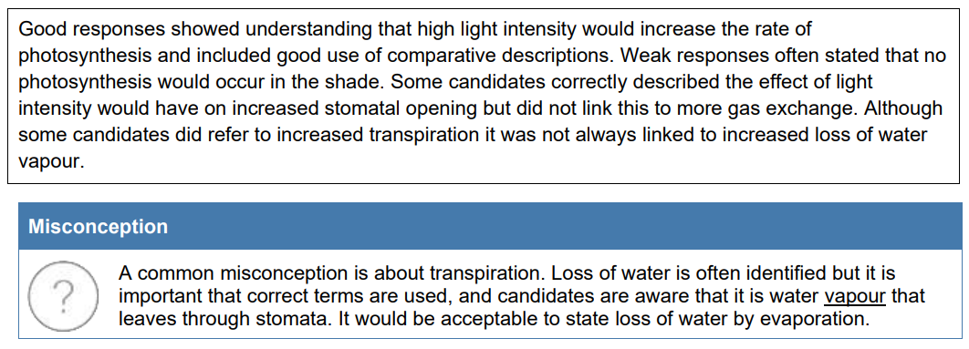 For example, in an OCR A-level biology examiner’s report from 2023, there was a question about why plants growing in high light intensity require more water than plants growing in shade, even when temperatures are the same. The examiner’s report in the screenshot below details the content of good responses as opposed to weak responses and common misconceptions about the topic. Note the point about the importance of using accurate scientific terminology like “water vapour” or “loss of water by evaporation”. Some examiner’s reports will also feature real examples of candidates’ responses so that you can see how to structure a response and how marks are allocated.